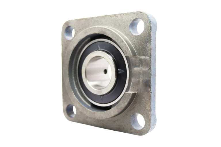 Heavy-duty square flange bearing unit requiring maximum mounting stability. Features robust cast iron construction with four-bolt M20 mounting configuration. Engineered for continuous operation in granulators, shredders, and heavy industrial machinery where superior load capacity and vibration resistance are essential.