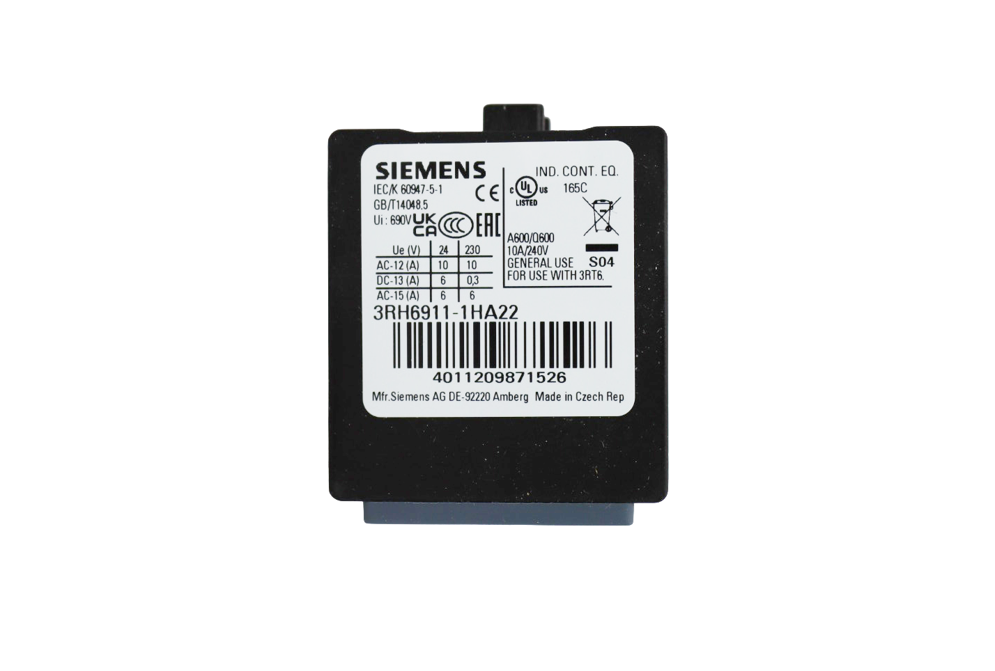 The 3RH1944/6911 Auxiliary Contact Block is a versatile expansion component designed to enhance the functionality of Siemens contactors in Virtus Equipment and ZERMA America material processing systems. This auxiliary contact block provides additional switching contacts for control circuits, interlocking, and status indication applications.