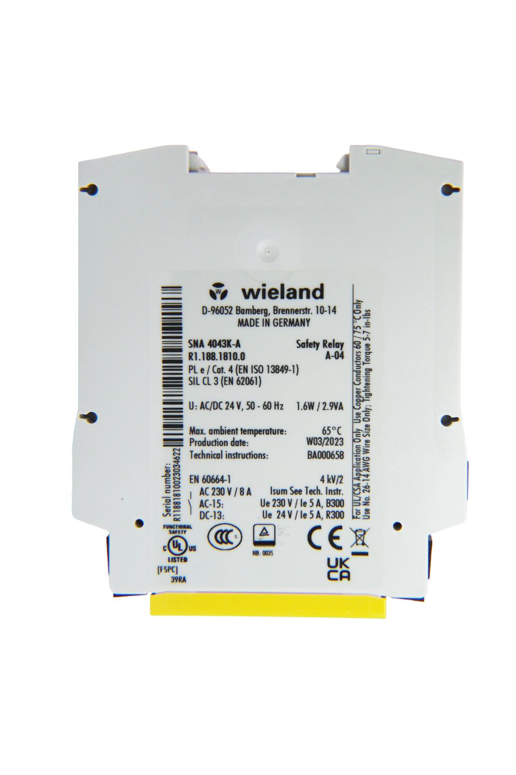 The SNA 4043K Safety Relay is a certified safety monitoring device specifically designed for Virtus Equipment and ZERMA America material processing systems. This industrial-grade safety relay module provides reliable monitoring of emergency stop circuits, safety guards, light curtains, and other safety devices with redundant architecture, ensuring operator protection and compliance with international machinery safety standards in demanding industrial applications.